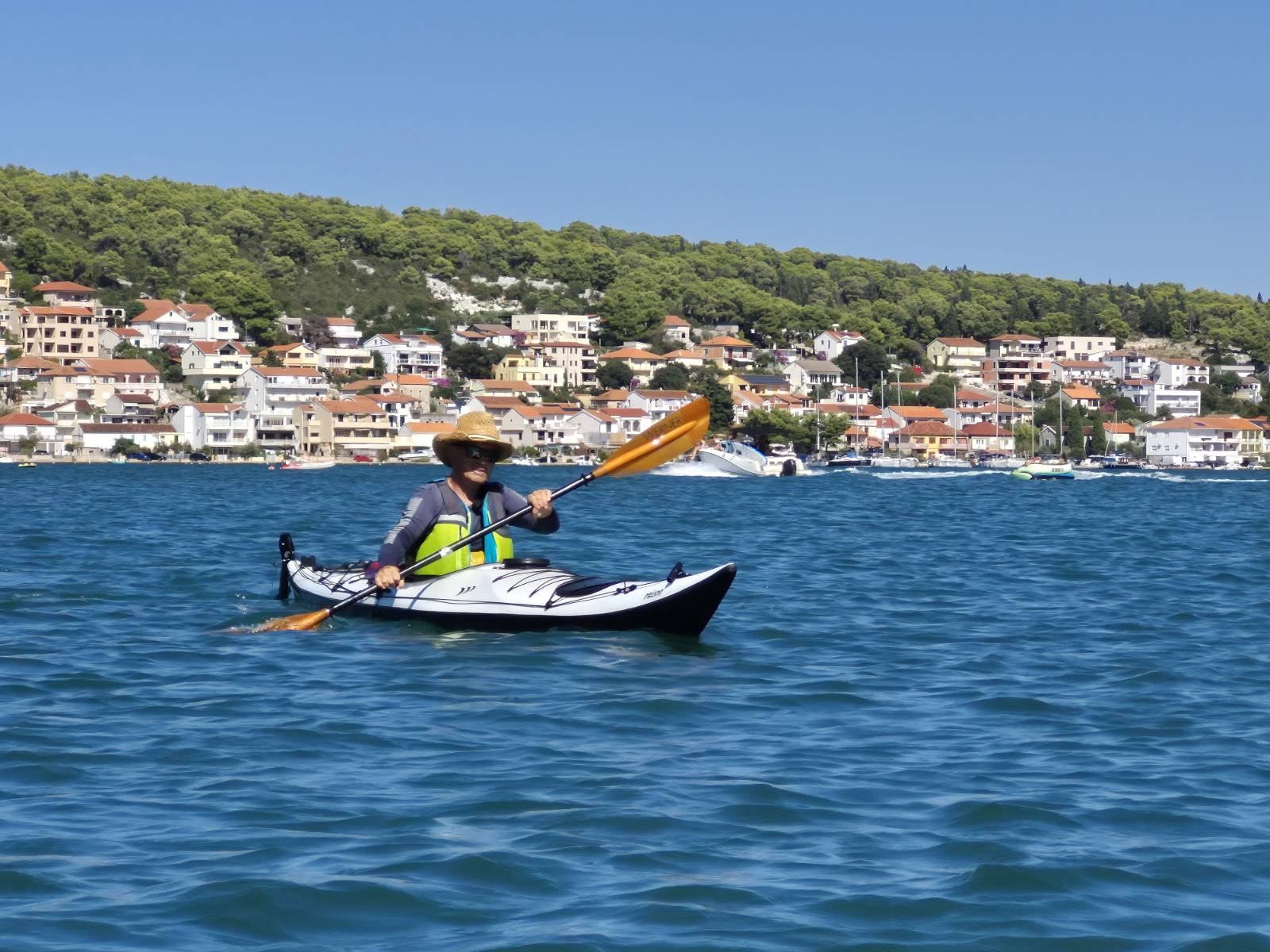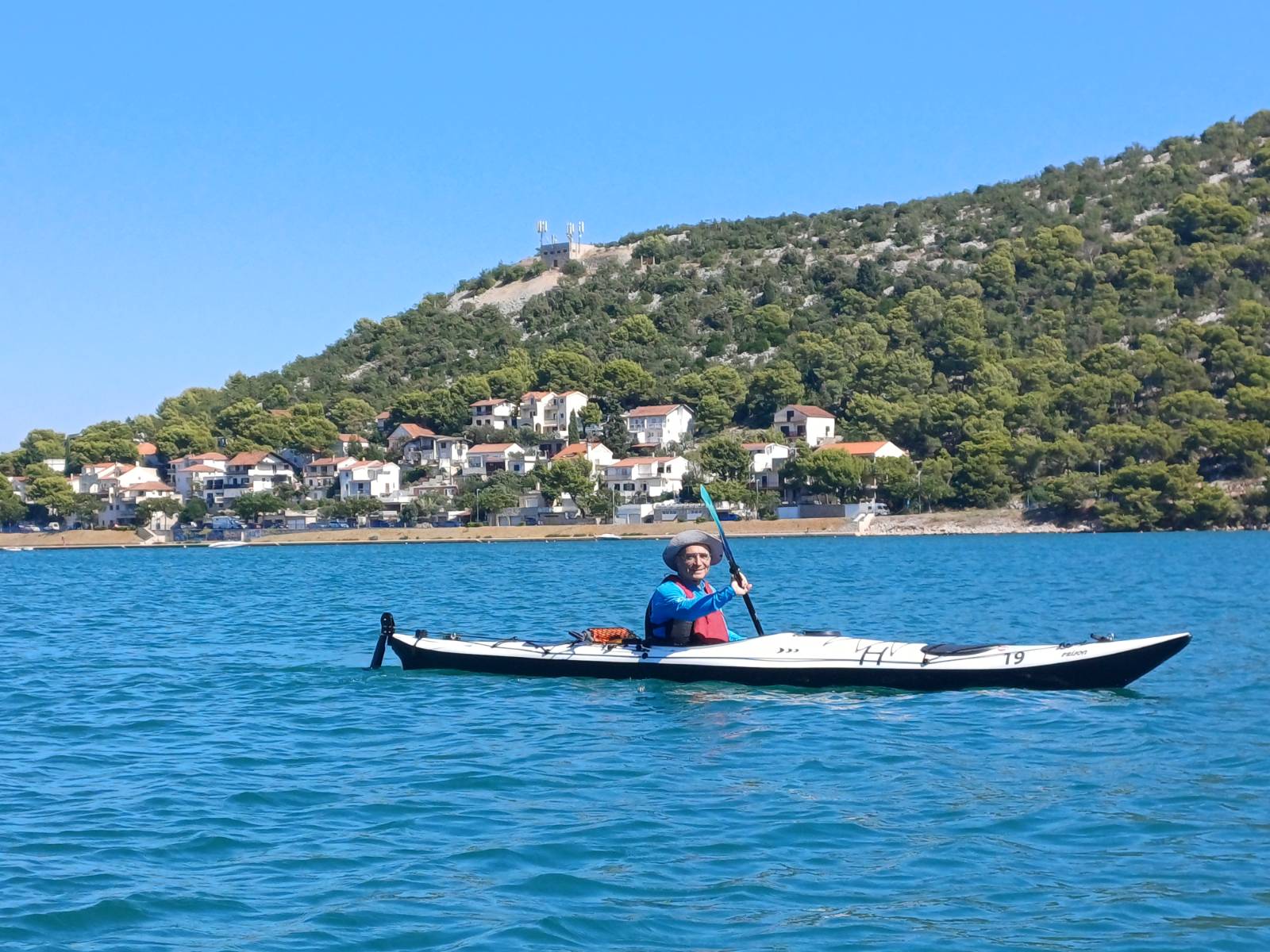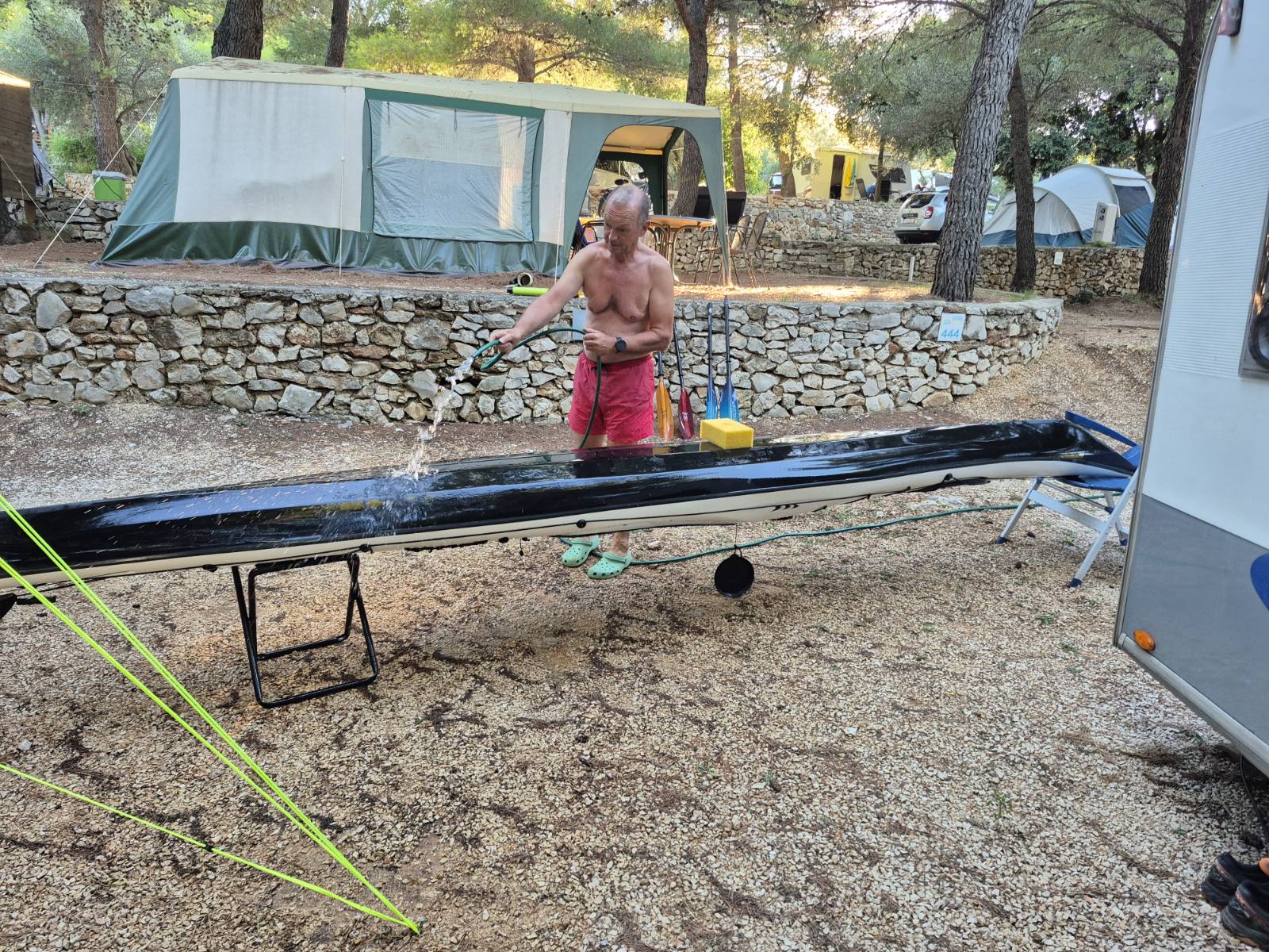 Was das Paddeln anlangte, legten Walter und Roland an einem Tag 24 km von den Krka Wasserfällen bis zu unserem Campingplatz zurück, wo ich nur eine Etappe mitfuhr. Auf den 24 km frischte der Wind auch einigermaßen auf, Schaumkronen ringsum, und so wurde es für sie ein sportlicher Tag.